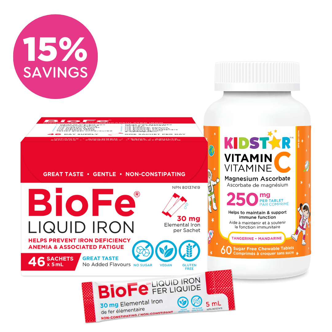 Vous vous demandez si vous consommez suffisamment de fer chaque jour ? Le Pack de fer pratique contient des sachets de fer liquide BioFe® pratiques et de délicieux comprimés de magnésium ascorbate enrichis en vitamine C. Les sachets de fer liquide BioFe® sont faciles à emporter partout. Sans sucre, le fer BioFe® ne constipe pas et ne provoque ni troubles digestifs ni taches sur les dents. Et surtout, il a bon goût ! La vitamine C favorise l’absorption du fer provenant des aliments et le magnésium ascorbate est doux pour le système digestif.