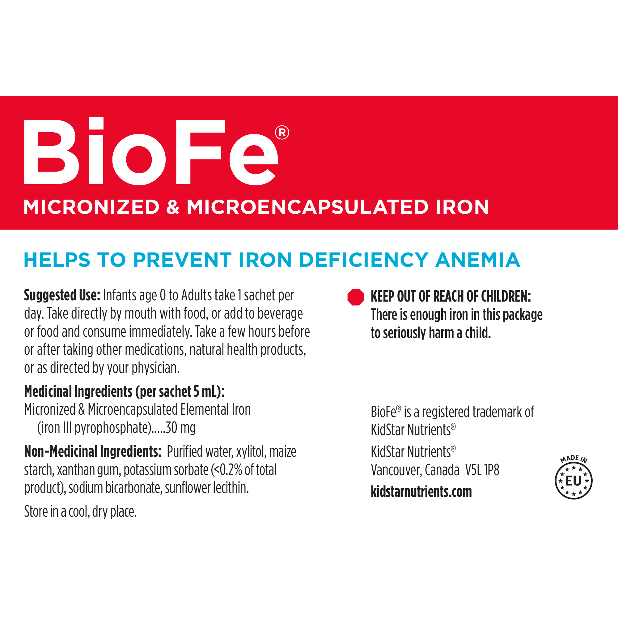 Un fer liquide à dose élevée et au goût agréable, adapté à tous les âges, dans un sachet pratique à emporter. Chaque sachet individuel contient 30 mg de fer élémentaire micronisé et microencapsulé. Le fer BioFe® est doux pour l'estomac, ne tache pas les dents et n'a aucun goût métallique. Sa formule apporte un supplément quotidien de fer qui contribue au maintien d'une bonne santé générale et d'un métabolisme énergétique normal.