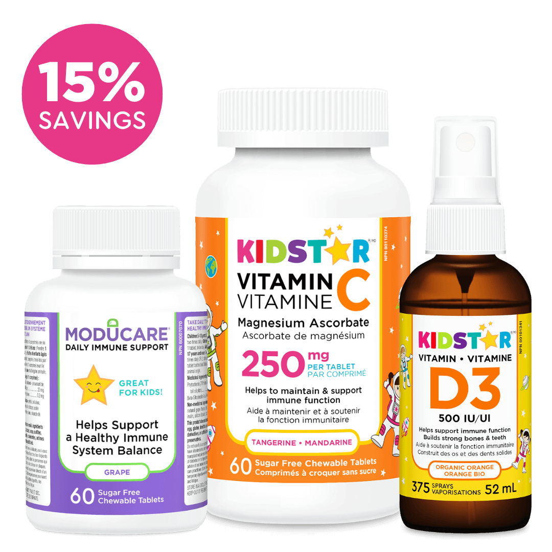The KidStar Immunity Bundle includes Moducare Grape Chewable (60 chewable tablets), Vitamin C tablets (60 chewable tablets), and Vitamin D3 Spray (52 mL). Support your child’s immune health with these tasty and fun daily supplements: natural grape and tasty tangerine in crunchy chewable tablets, and organic orange in an easy-to-use spray!