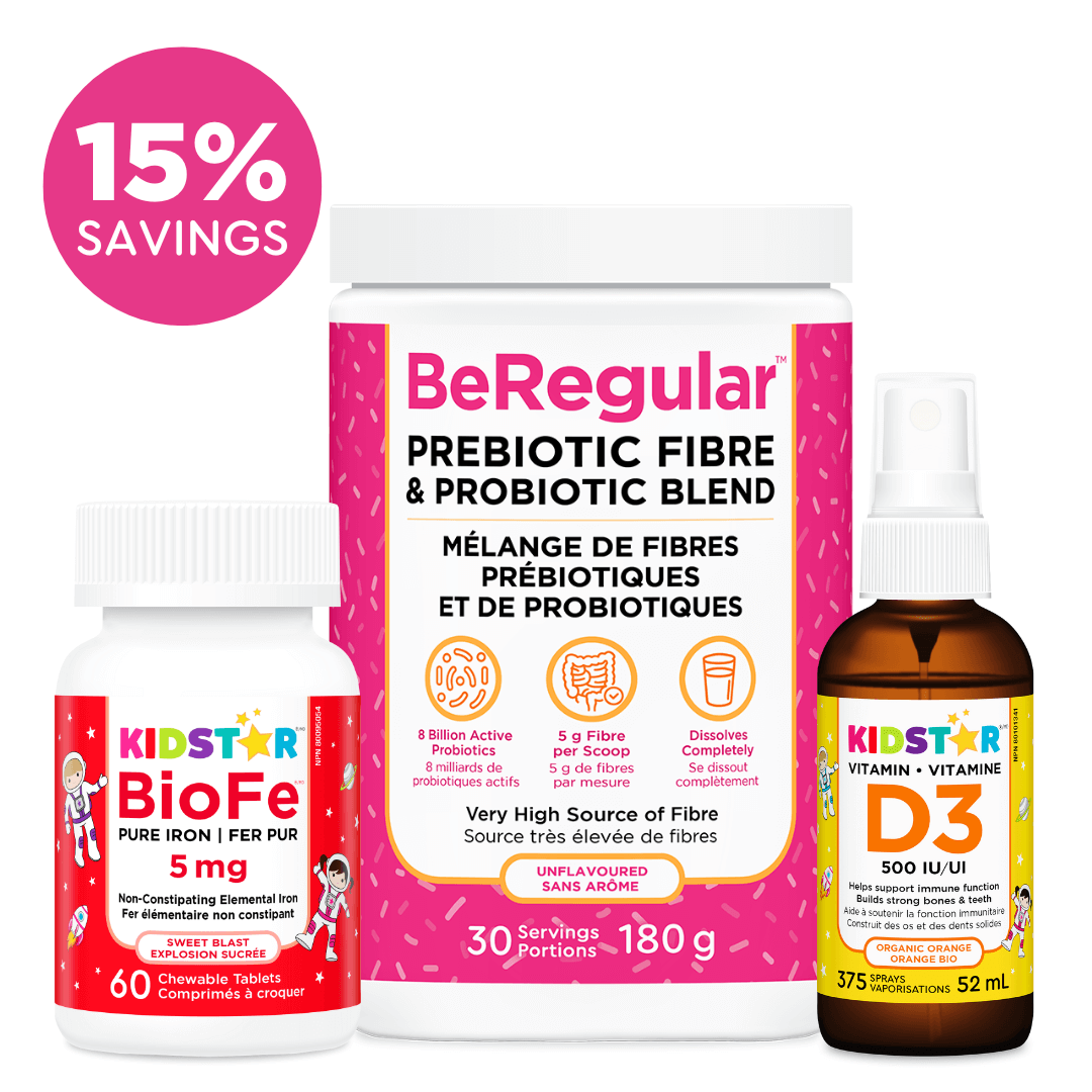 KidStar’s Star Digestion Bundle includes BeRegular prebiotic fibre and probiotic blend (180 grams), BioFe Pure Iron Chewable Tablets (60 chewable tablets), and Vitamin D3 Spray (easy-to-use spray with organic coconut oil and organic orange).