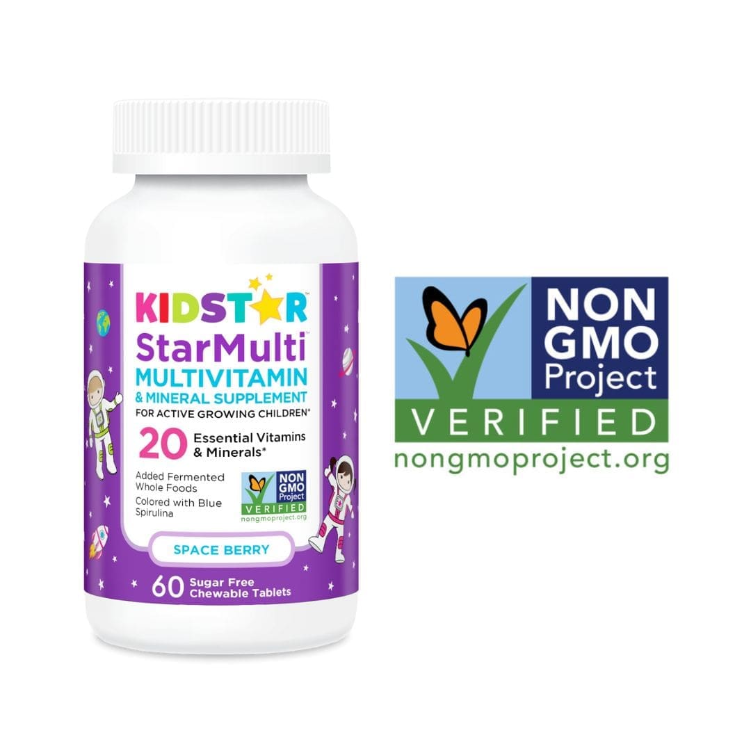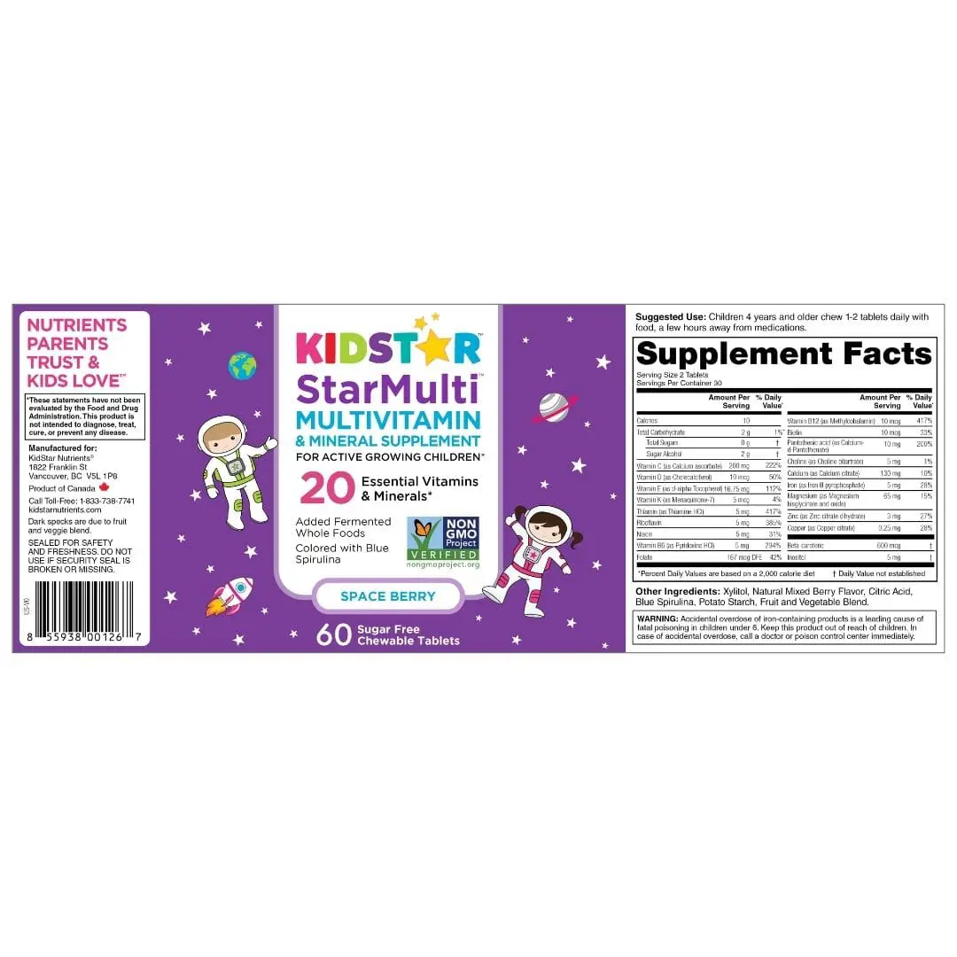 Kids can be picky eaters. Help fill in the gaps with StarMulti®, a complete multivitamin and mineral formula for kids ages 3 and up. StarMulti contains 20 essential vitamins and minerals for active growing children. StarMulti is shaped into fun astronaut-shaped chewable tablets colored with blue spirulina, a powerful antioxidant. StarMulti is free from sugar and artificial colors, flavors, or sweeteners. Flavored with natural raspberry and strawberry. StarMulti is vegan.