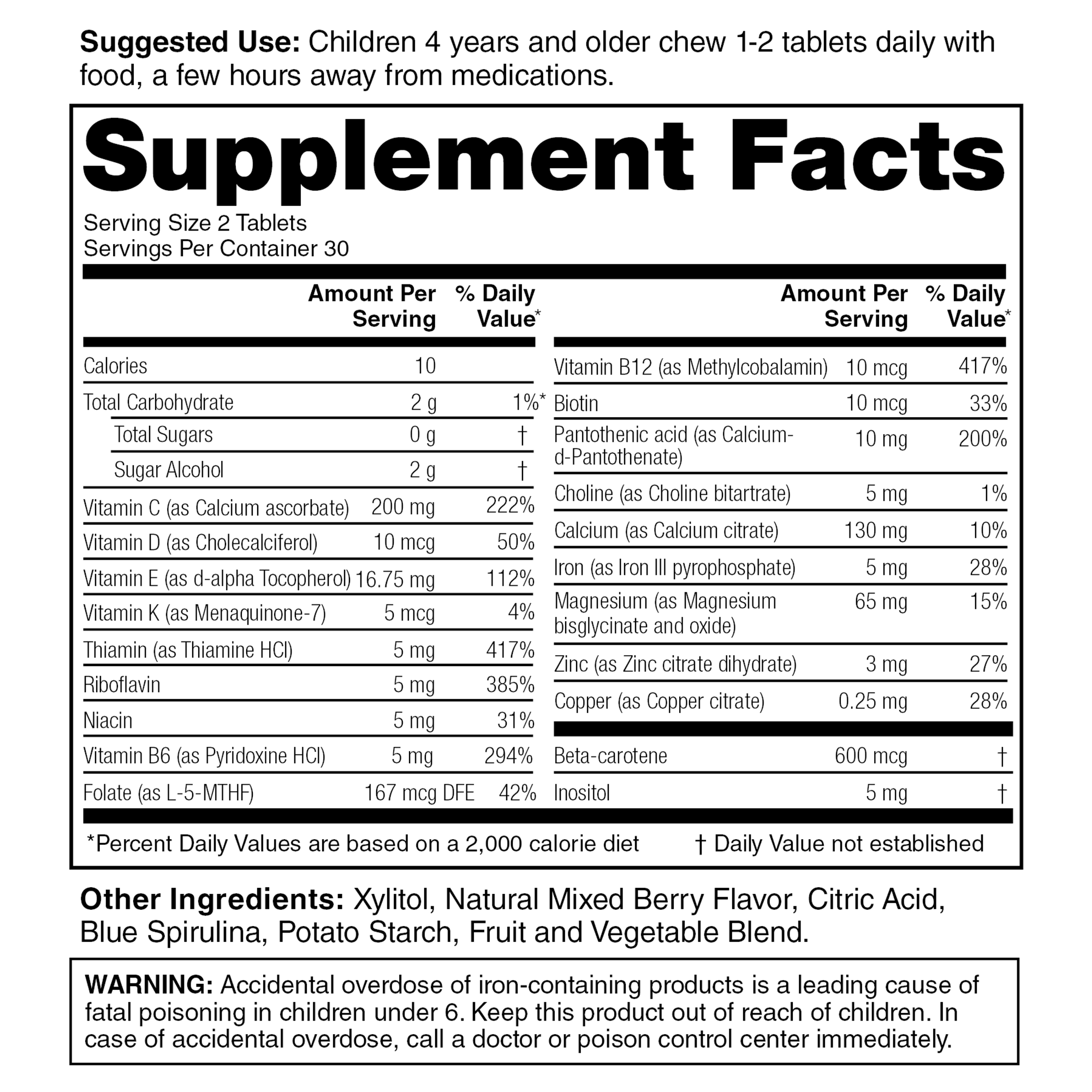 Like all KidStar nutrients, StarMulti is free from harmful fillers, colors, sweeteners, and flavors. Colored with spirulina, flavored with natural berries, and sweetened with xylitol. Xylitol not only makes StarMulti taste great but it also reduces dental decay.