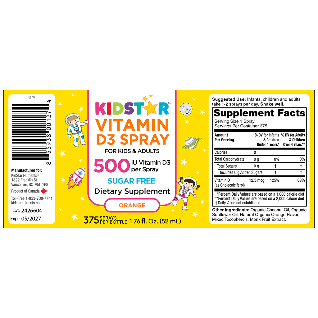A delicious, sugar-free, and fun way to get your daily vitamin D. KidStar’s Vitamin D3 is an easy-to-use spray in an organic coconut MCT oil base, flavored with organic orange and sweetened with monk fruit. This vitamin D3 spray is formulated for children and adults to help support the development of teeth, bones, and the immune system.
