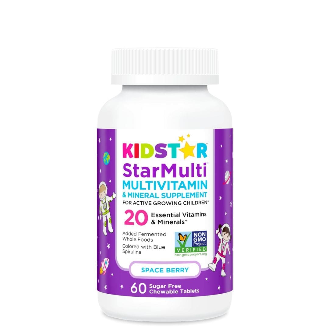 Kids can be picky eaters. Help fill in the gaps with StarMulti®, a complete multivitamin and mineral formula for kids ages 3 and up. StarMulti contains 20 essential vitamins and minerals for active growing children. StarMulti is shaped into fun astronaut-shaped chewable tablets colored with blue spirulina, a powerful antioxidant. StarMulti is free from sugar and artificial colors, flavors, or sweeteners. Flavored with natural raspberry and strawberry. StarMulti is vegan.